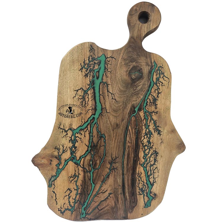 Залята с епоксидна смола, дъската не само че придобива зашеметяващ блясък, но и е защитена от влага и износване, което я прави идеална за ежедневно използване. Смолата запълва всяка неравност, създавайки гладки и устойчиви повърхности, които са перфектни за сервиране на мезета, сирена, хляб и всичките ви любими ястия.